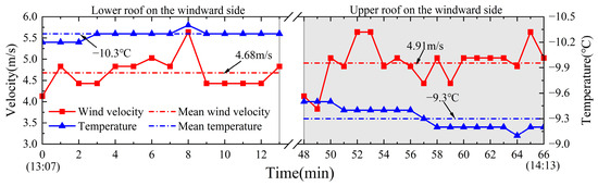 The corresponding wind speed and temperature in the field measurements are illustrated in Figure 9. When the lower roof was on the windward side, the mean wind speed was 4.68 m/s, and the mean temperature was −10.3 °C. It took about 13 min to reach the final pattern of snow distribution. On the other hand, the windward snowdrift reached its final pattern in about 18 min, during which the mean wind speed was 4.91 m/s, and the mean temperature was −9.3 °C. The field measurements were conducted from 13:07 to 14:13, and the wind speed and temperature were relatively stable.