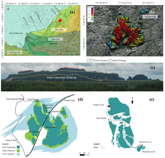 (a) Location map of the study area, Subis Limestone, in Niah, Sarawak (red square), with emphasis on the tectonic features [1,33,34,35,36]. (b) Subis build-up on SRTM-Digital Elevation Model (DEM) overlay with a satellite image for clearer lineament delineation. The Subis build-up was divided into two sections by an NE–SW-trending Trusan Fault (white solid line) with several identified internal faults (white dotted lines) that separate the mega limestone into isolated build-ups. (c) Flat-top geomorphology of Subis Limestone with the upper portion of the catch-up phase. Different elevations of vegetation indicate the third-order sequence boundary due to sea level changes, now represented by three horizons (base-, inter-, and top-carbonate layers). (d) Karst topography distribution [29]. The route of the fieldwork began from the Niah National Park headquarters (HQ) to the Painted Cave. (e) A detailed route map within the Great Cave Complex and Painted Cave. The karst features and fault/ fracture evidence were observed along this route.
