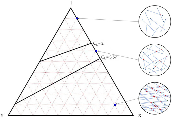 Triangular plot of I–X–Y proportion, based on Manzocchi [63]. CL (contour line) represents the average number of connections per line (black solid lines). The specific values of intersections per line were described by Sanderson and Nixon [56]. The three sets of traces that simulate fracture networks show how the fracture network topology is characterised using the I–X–Y parameters.