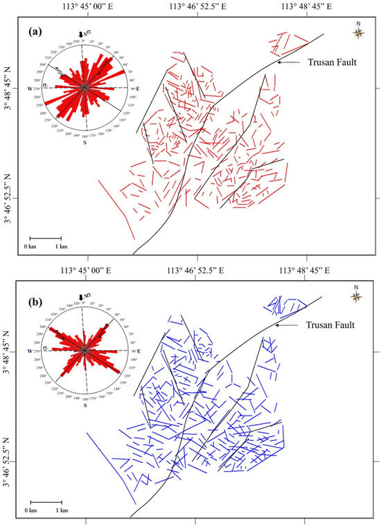 Lineament analysis and rose diagrams from a dataset of (a) SRTM-DEM and (b) ALOS-DSM with a resolution of 30 m. Both lineaments showed similar main fracture sets that were oriented in northeast–southwest and northwest–southeast directions, with north–south-trending compressional stress and extensional stress in the east–west direction. The previously interpreted northeast–southwest dextral Trusan Fault and interpreted faults are shown in black lines [33,65]. The interpretation is strictly based on the localised data in the study area.