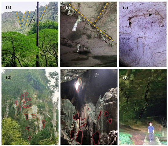 (a) Conjugate faults observed along the walkway from Traders’ Cave to the Great Cave. (b) Calcite-filled fractures on the ceiling of Painted Cave with strike trending in north–south and northeast–southwest directions. Stalactite formation was observed due to precipitation via the fractures. (c) Stylolite fractures in the Great Cave. (d) Enhanced fractures due to dissolution on the isolated limestone hill. (e) Doline and the dissolved cavities with the majority of vertical fractures. (f) Large west–northwest–east–southeast striking vertical fractures at the exit of the Great Cave in the south.