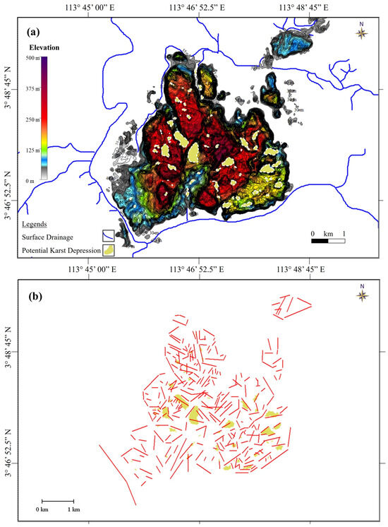 This study identified 79 potential dolines or karst depressions by visualising the SRTM-DEM in the Niah–Subis build-up (Figure 8a). The largest doline (0.147 km2) was found in the middle of the paleo-karst build-up, while the smallest doline (9.8 m2) was found closer to the surface river network (Figure 8b). The doline size distribution demonstrates the inter-relationship between the surface and underground drainage systems in the development of karstic processes. The subsurface drainage dissolved the subaerial limestone build-up, causing the ceiling of the structure to collapse. On the topography map, it appears as a closed depression (Figure 8a). The Niah regional lineaments and doline distribution were compared (Figure 8b), demonstrating that the larger dolines were bounded or intersected by lineaments of greater intensity.