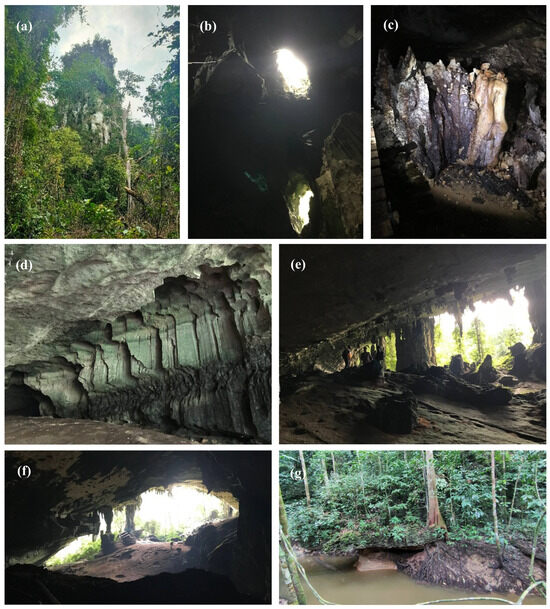 The Traders’ Cave and the Great Cave Complex of the Subis Limestone build-up have their entrances on a west-facing cliff of a steep-sided karst tower located in the northwest of the entire Subis build-up (Figure 1d,e). The Traders’ Cave is a vast isolated passage that extends mainly north–south and parallel to the cliff. In contrast, the Great Cave Complex comprises intricate passages that mostly trend in the east–west and north–south directions. The cave entrances are estimated to be 80 m tall, with the overall karst hill standing between 180 m and 190 m tall. Conjugate fractures encircle the karst hill on all sides. The Traders’ Cave’s exit leads to the Great Cave’s entrance via the timber walkway in the south and is connected to the route to the Painted Cave in the southeast. The passages form laterally extensive networks that consist of massive karst passages.