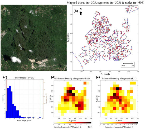 (a) Satellite image of Subis build-up covered by high-intensity of vegetation. (b) Two-dimensional DFN model based on the lineament traces. Nodes in black circles and trace mid-points in red circles were used to represent the traces. (c) Length distribution. (d) Estimated density of the fractures (P20). (e) Estimated intensity of fractures (P21) [scale: 100 pixels = 1 km].