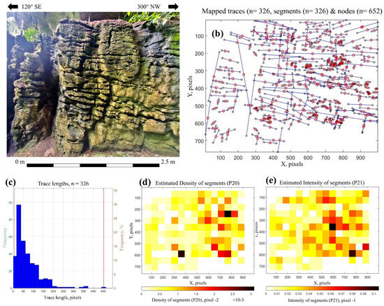 (a) Enlarged open fractures due to dissolution. (b) Two-dimensional DFN model based on the outcrop-scale fracture traces. Nodes in black circles and trace mid-points in red circles were used to represent the traces. (c) Length distribution. (d) Estimated density of the fractures (P20). (e) Estimated intensity of fractures (P21) [scale: 800 pixels = 2.5 m].