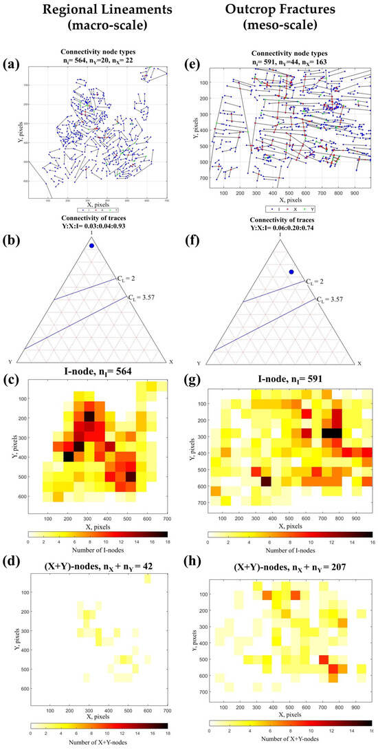 The connectivity of traces (isolated (I), splay or abutment (Y), and intersection (X) for regional lineaments (a–d) and outcrop fractures (e,h). A ternary plot of fracture segment connectivity (b,f) lineaments and fracture traces on (a,e). (c,g) Heat maps of I nodes and (d,h) X + Y nodes.
