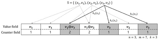 Figure 1 presents an example of inserting elements into an rCBF with , , and . To insert element (, ) into the cells pointed to by , , and , is XORed with the values in the cells (i.e., rCBF = rCBF for i = 1, 2, 3), and all counters in the cells are incremented by 1, except for counters with (i.e., rCBF = rCBF + 1).