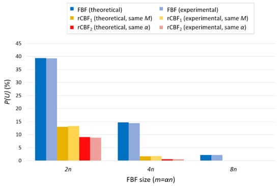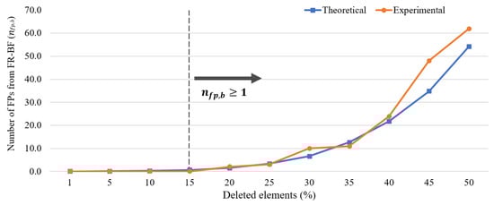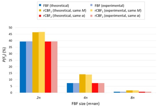 If an FBF supporting the deletion operation is constructed, the search failure probability of the FBF is the same as that of the rCBF. In addition, the undeletable probability of the FBF () is the same as in (5). When using the same m, n, and k for the rCBF and FBF, under the constraint (i.e., ). Hence, the L-rCBF using an rCBF is more suitable for dynamic data processing than the L-FBF using an FBF.