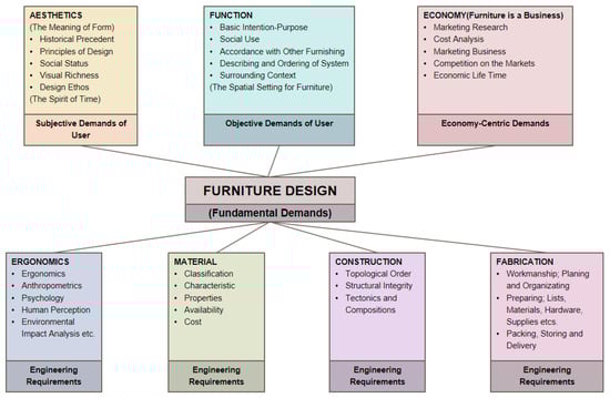 There are three key design elements to consider when creating any kind of furniture. The first is functional design, which involves determining the intended function of furniture and identifying the primary benefits it is expected to provide (Figure 1) [1]. Aesthetic design, on the other hand, focuses on the artistic aspects of furniture design, encompassing features such as form, texture, color, and shape, while taking into consideration the influence of relevant cultures or fashion trends, as well as the demands of consumers [2,3,4,5]. Engineering design, which is the last key element of design, is the process of determining the most appropriate ergonomic criteria, materials, construction techniques, and manufacturing technologies [6,7,8,9,10,11,12].