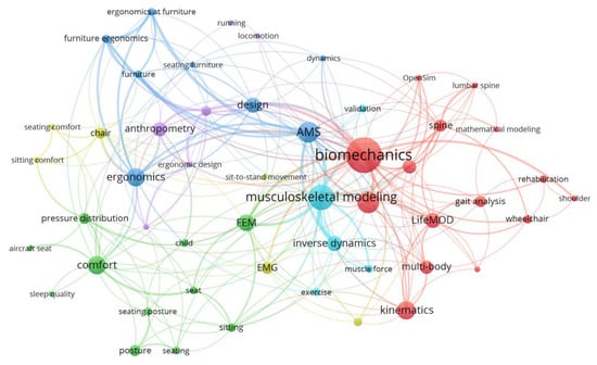 In Cluster #3 (blue), the largest node is the AnyBody Modeling System (AMS), which primarily relates to furniture design, ergonomics, furniture ergonomics, and seating furniture. This cluster is focused on applying biomechanical knowledge applied in the field of furniture design, particularly from an ergonomic perspective. Additionally, it demonstrates that AMS is the prevalent computer simulation software used in furniture design.