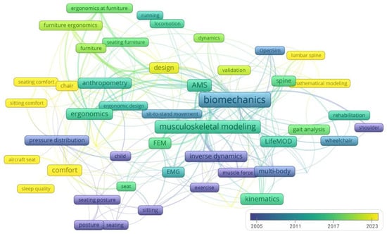 The primary components of recent biomechanics research in furniture design include simulation software, furniture design, experimental research, and motion mechanics analysis. These were identified through a thorough analysis of the most current research areas in furniture biomechanics in combination with a literature review. Figure 3 depicts the co-occurring trends in keyword research based on VOSviewer and distinguishes different years through color-coding.