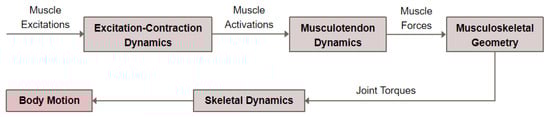 The model of the human center of mass provides a basic description of the principles governing human movement, enabling us to comprehend the trajectory, velocity, acceleration, and other factors associated with motion [73]. Human motion biomechanics problems are more analyzed by a multi-rigid body model. According to the actual needs, a multi-rigid body model can be a simple local joint model or a complex whole body model [79]. As shown in Figure 5 [75,80], a more complete model for human motion simulation should include: (1) a skeleton model; (2) a muscle path model; (3) a musculotendon actuation model; (4) a muscle excitation–contraction coupling model; and (5) a motor task goal model.