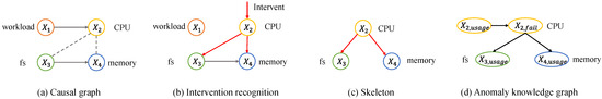 The processes of intervention recognition and anomaly knowledge graph construction. (a,b) show the process of intervention recognition. (c,d) present the construction of an anomaly knowledge graph.