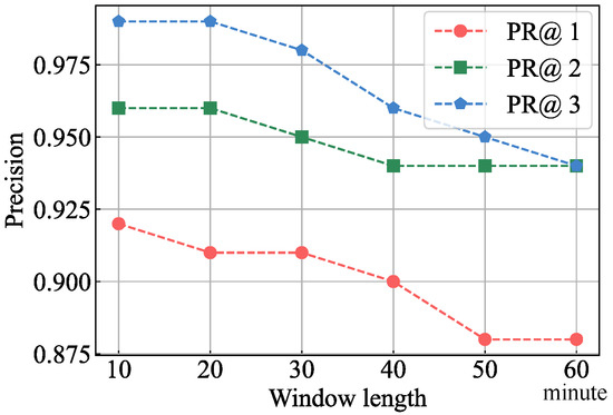 Precision variation with different length of time window in Anomaly Microservice Location.