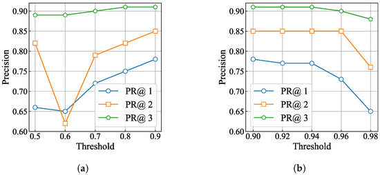 Precision variation with different value of anomaly propagation threshold . (a) Performance with ranges from 0.5 to 0.9; (b) performance with ranges from 0.9 to 0.98.