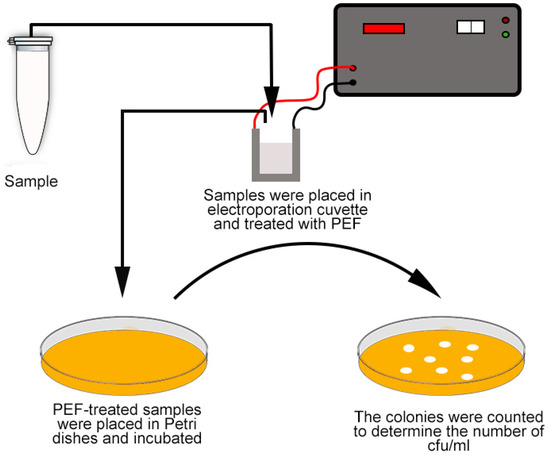 Experimental procedures were performed as depicted in Figure 1. The whey samples were transferred to an electroporation cuvette, electroporated, and the resultant suspension was subsequently transferred to petri dishes, wherein colony-forming units were counted.