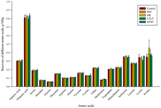 Amino acid content in milk samples treated with different pasteurization techniques: control (raw milk); PEF—pulsed electric field; MF—microfiltration; LTLT—low temperature, long time; HTST—high temperature, short time.