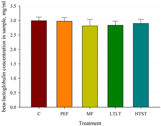 β-lactoglobulin content in milk samples subjected to various pasteurization methods: C—raw milk (control); PEF—pulsed electric field; MF—microfiltration; LTLT—low temperature, long time; HTST—high temperature, short time.