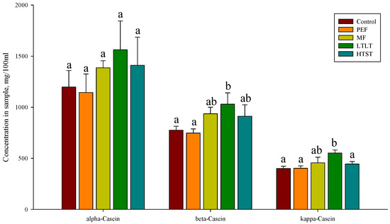α-Casein, β-casein, and κ-casein content in milk samples subjected to various pasteurization methods: Control (raw milk); PEF—pulsed electric field; MF—microfiltration; LTLT—low temperature, long time; HTST—high temperature, short time. Statistically significant differences between samples are denoted by distinct lowercase letters, with a significance level of p < 0.05.