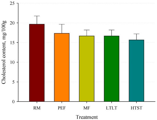 Cholesterol content in milk samples subjected to various pasteurization methods: RM—raw milk (control); PEF—pulsed electric field; MF—microfiltration; LTLT—low temperature, long time; HTST—high temperature, short time.