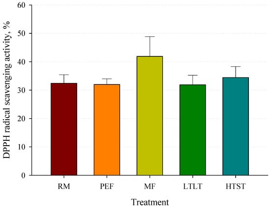DPPH radical scavenging activity, expressed as a percentage, across various pasteurization methods: RM—raw milk (control); PEF—pulsed electric field; MF—microfiltration; LTLT—low temperature, long time; HTST—high temperature, short time.