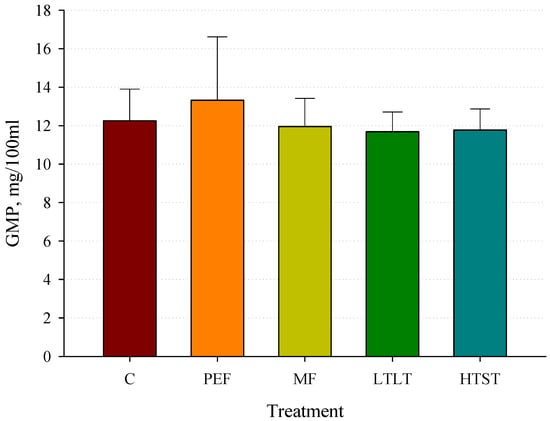 Figure 8 illustrates the impact of various pasteurization methods and PEF treatment on the glycomacropeptide (GMP) content in milk samples. No significant differences were observed in GMP content between the control group and the samples subjected to PEF, MF, LTLT, and HTST treatments. The control samples exhibited an average GMP content of 12.25 mg/100 mL. PEF-treated samples had an average GMP content of 13.32 mg/100 mL, while MF-treated samples showed an average GMP content of 11.95 mg/100 mL. In addition, LTLT-treated samples exhibited an average GMP content of 11.68 mg/100 mL, and HTST-treated samples had an average GMP content of 11.78 mg/100 mL.
