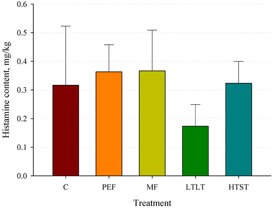 Histamine content in milk samples subjected to various pasteurization methods: C—raw milk (control); PEF—pulsed electric field; MF—microfiltration; LTLT—low temperature, long time; HTST—high temperature, short time.