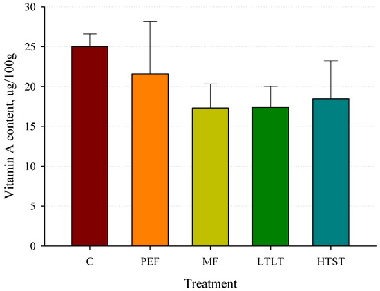 Vitamin A content in milk samples subjected to various pasteurization methods: C—raw milk (control); PEF—pulsed electric field; MF—microfiltration; LTLT—low- temperature, long time; HTST—high temperature, short time.
