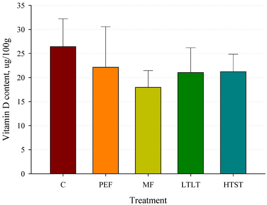 Vitamin D content in milk samples subjected to various pasteurization methods: C—raw milk (control); PEF—pulsed electric field; MF—microfiltration; LTLT—low temperature, long time; HTST—high temperature, short time.