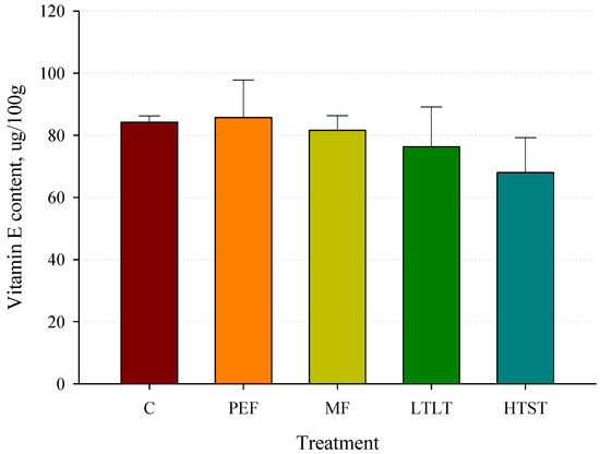 Vitamin E content in milk samples subjected to various pasteurization methods: C—raw milk (control); PEF—pulsed electric field; MF—microfiltration; LTLT—low temperature, long time; HTST—high temperature, short time.