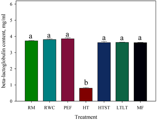 β-lactoglobulin content in whey samples subjected to various pasteurization methods: RM—raw milk (control); RWC—raw whey control; PEF—pulsed electric field; HT—high temperature; HTST—high temperature, short-time; LTLT—low temperature, long time; MF—microfiltration. Statistically significant differences between samples are denoted by distinct lowercase letters, with a significance level of p < 0.05.