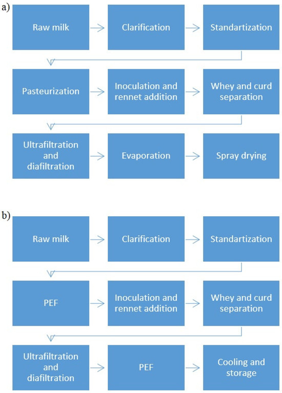 - Luis, R.D.; Arias, O.; Puertolas, E.; Benede, S.; Sanchez, L.; Calvo, M.; Perez, M.D. Effect of high—Intensity pulse electric fields on denaturation of bovine whey proteins. Milchwissenschaft 2009, 64, 422–426. [Google Scholar]