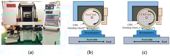 Precision grinding machine and auxiliary facilities. (a) ESG-1020CNC Grinding Machine. (b) The diamond wheel of the steel hub. (c) The diamond wheel of the CFRP hub.