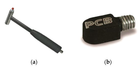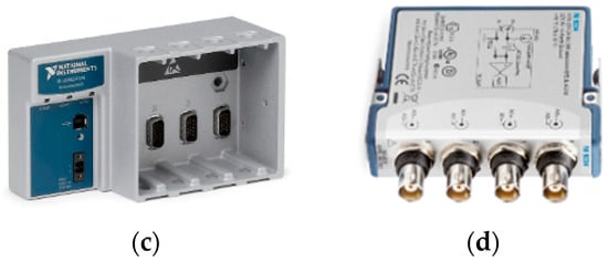 The auxiliary facilities of the static analysis. (a) Impact hammer. (b) Accelerometer (Model: 352C23). (c) Data acquisition platform built (Model: Card/NI-9174). (d) Sound and vibration input module (Model: NI-9234).