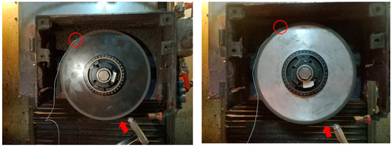 Due to the resistance, the body will lead to energy loss when it is in oscillation. As the resistance weakens the energy of the system constantly, the energy of the oscillation decreases steadily. Then, the oscillation will finally stop. This mechanism is called the damping effect [22]. This study used a dynamic balance instrument from Covers Plus International Co., Ltd.—WB-7000SP—(Taipei, Taiwan) to measure the vibration of the steel and CFRP hubs when the grinding wheel was in a static state, as shown in Figure 4.