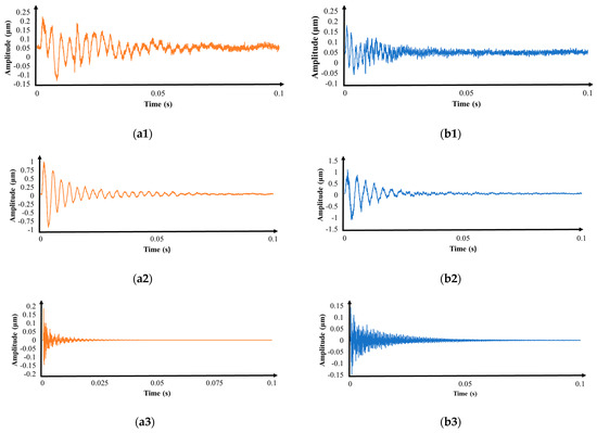 Relationship of amplitude and time when the grinding wheel of the CFRP and steel hubs are tapping at different frequencies. (a1) The grinding wheel of CFRP hub vibration at 300 Hz. (a2) The grinding wheel of CFRP hub vibration at 500 Hz. (a3) The grinding wheel of CFRP hub vibration at 5500 Hz. (b1) The grinding wheel of steel hub vibration at 300 Hz. (b2) The grinding wheel of steel hub vibration at 500 Hz. (b3) The grinding wheel of steel hub vibration at 5500 Hz.