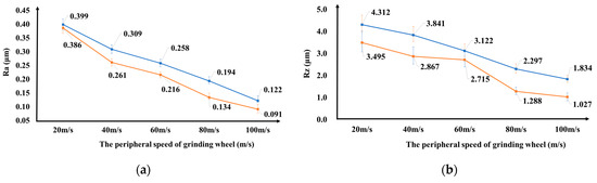 The surface roughness in Ra and Rz after the diamond wheel of the CFRP hub (orange) and steel hub grind (blue) at 1.0 μm in the WC workpiece. (a) represent the relationship in Ra and the peripheral speed of grinding wheel. (b) represent the relationship in Rz and the peripheral speed of grinding wheel.