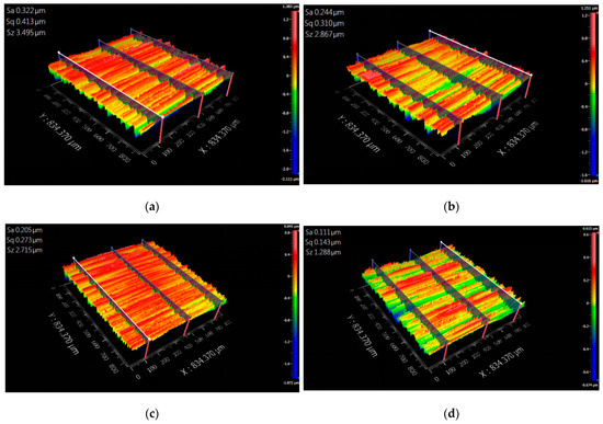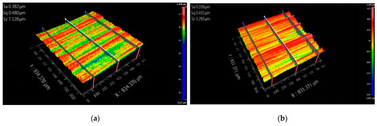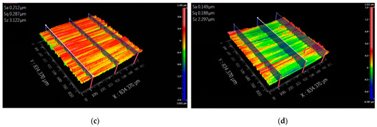 It is intriguing that despite working under identical grinding conditions, the grinding wheel with a CFRP hub consistently delivers a finer surface roughness. However, this phenomenon remains inadequately explained when considering factors like the grinding wheel’s weight, the material properties of the hub, and the abrasive characteristics alone. To delve deeper into this phenomenon, a visual examination of the surfaces generated by both material hubs was conducted using Zygo NewView8000. Figure 7 and Figure 8 clearly depict the striking differences between the surfaces created by these two distinct material hubs, especially when subjected to varying peripheral speeds. The surfaces produced by the CFRP hub exhibit minimal height variations, resulting in a smaller Rz value than those generated by the steel hub. This visual evidence underscores the pivotal role of the hub material in shaping surface quality. It underscores the unique advantages of the CFRP hub in achieving superior surface finishes across a range of grinding conditions. Furthermore, it is worth noting that there are more pronounced changes in surface elevation when the steel hub is used at high peripheral speeds of the grinding wheel. These heightened changes can be attributed to the high-frequency vibrations generated within the grinding wheel, particularly when equipped with the steel hub material. These vibrations contribute to a more brittle material removal process, further underscoring the hub material’s importance in influencing the grinding outcome.