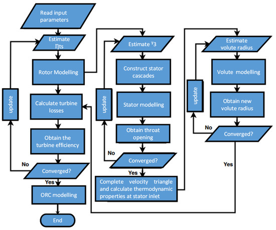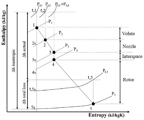 Volute, stator vanes, and rotor blades are the three primary parts of the radial inflow turbine, as depicted in Figure 2. Figure 3 presents a meridional view of the turbine stage. The flow is firstly collected in the volute, accelerated, and further expanded through the stator vanes and directed to the rotor blades at the proper angle. Finally, the fluid rotates the rotor blades, converting the kinetic energy into mechanical power. The turbine is coupled to an electrical generator to convert the mechanical power into electrical power. The design process is depicted in Figure 4 and detailed in the following subsections. Figure 5 presents an enthalpy–entropy diagram of the turbine stage.