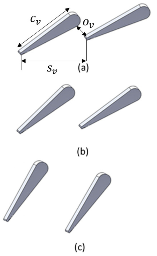 Three different stator openings are investigated, namely, 30%, 60%, and 100%, as shown in Figure 6. The stator opening is controlled by varying the stator width, , as shown in Equation (21). The stator throat width is shown in Figure 6, where sv is the nozzle pitch, as shown in Figure 6. are the sonic condition density and the speed of sound, respectively.