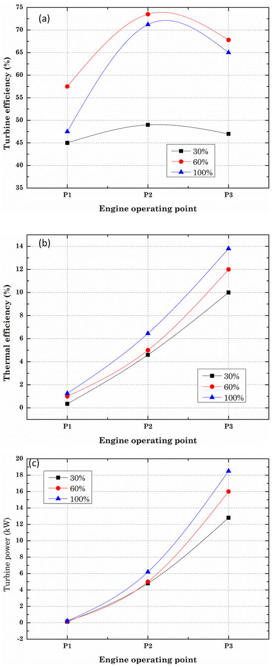 Figure 7c depicts the behavior of turbine power with different stator openings and various engine operating points. It is clear that the 100% opening is superior for all the investigated engine points. This is expected, since turbine power is directly related to the mass flow rate and the enthalpy drop through the turbine. P3 with a 100% stator opening presents the highest turbine power with 18.5 kW. The 30% and 60% stator openings present maximum values of 12.60 and 16 kW, respectively. Again, as the mass flow rate decreases, the turbine power decreases according to Equation (18). Figure 7c shows that the 30 and 60% throat openings present comparable turbine power at engine point P2. This is due to the comparable exhaust temperatures as per Table 1.