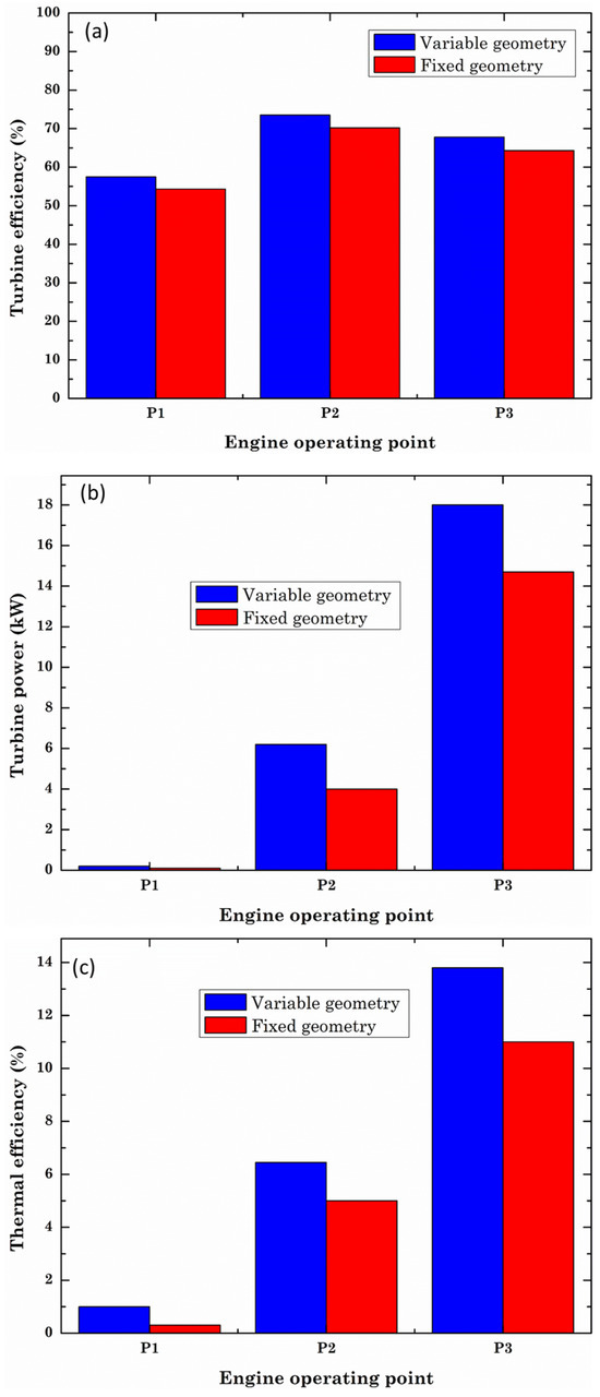 Comparison between fixed and variable geometry turbines for (a) turbine efficiency, (b) turbine power, and (c) cycle thermal efficiency at different engine operating points.