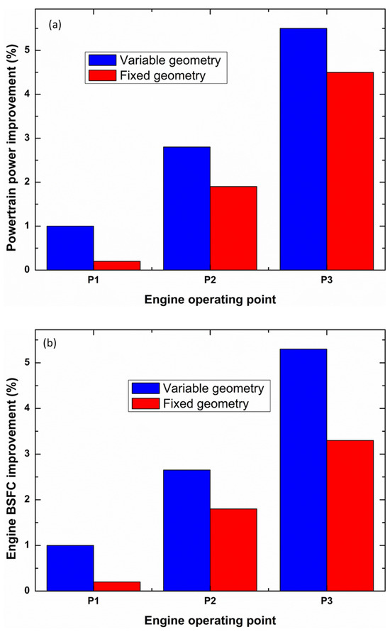 Comparison between fixed and variable geometry turbines for (a) powertrain power and (b) engine BSFC.
