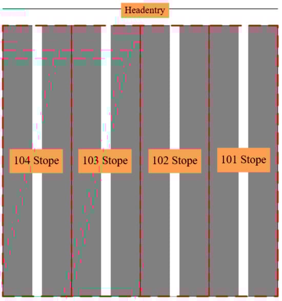 As seen in the stope’s cross-sectional diagram (Figure 2), there is a gangue (waste rock) located at the position of 51 m into the stope, with a thickness of about 8 m. To improve the recovery rate, it was proposed to reserve the area where the gangue is located as a reserved pillar. To determine the optimal size of the pillar, the calculation model as shown in Figure 4 was established in this study, where w represents the width of the pillar. The ore body on both sides of the pillar is recovered through medium deep-hole blasting, forming rectangularly shaped openings. This calculation model aimed to determine the optimal size of the pillar by establishing the relationship between the pillar width and the safety coefficient of the pillar as well as the recovery rate.