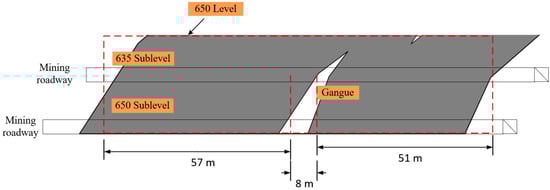 Based on the onsite experience and relevant requirements of the mine, the maximum span of an open area in Level 650 should not exceed 60 m. When the stope length is greater than 60 m, a pillar needs to be reserved in the middle of the stope, with the interval between pillars not exceeding 60 m. The design thickness of the pillars generally ranges between 12 and 20 m. To enhance the recovery rate, the area where the gangue shown in Figure 2 is situated is proposed to be preserved as a pillar. This study combined theoretical analysis with the onsite experience to carry out the parameter optimization design for the pillar, aiming to determine the optimum thickness of the pillar.
