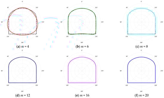 Figure 5 presents the variation curve of fabre as the number of terms Ck, denoted by m, increases. It is observed that as m increases from 4 to 9, fabre rapidly decreases, indicating that the accuracy of the mapping function significantly improves. When m is greater than 9, fabre essentially stabilizes within a range close to 0, signifying that the mapping function has achieved a high level of accuracy at this point. Figure 6 further illustrates the comparison between the mapped shapes and the original shapes under different m values. It is noticeable that at m = 4, the discrepancy between the mapped shape and the original shape is very pronounced. When m reaches 8, the difference between the two becomes minimal. For cases where m > 8 in the figure, there is virtually no difference between the mapped shape and the original shape, showcasing a high degree of congruence. In such cases, the mapped and original shapes are nearly overlapping entirely as seen in Figure 6d–f. Therefore, combining Figure 2 and Figure 3, in this study, for the calculation model of the planar section containing a tri-center arch roadway as shown in Figure 1, the number of terms m for the mapping function Ck was chosen to be 9. Since the term C2 does not affect the shape and size of the mapping, it implies that it does not impact the stress solution for the external surrounding rock of the opening, and hence C2 was taken as 0. The final expression of the mapping function for the plane containing a single tri-center arch opening is as follows: