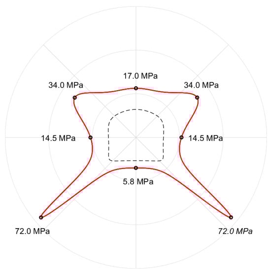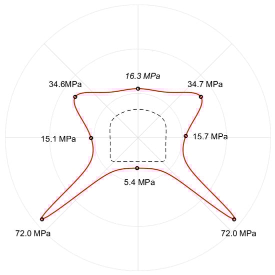 Figure 7 illustrates the distribution curve of hoop stress at the cross-section boundary of the roadway, derived from the calculation model depicted in Figure 3, in scenarios where no adjacent roadway exists. The stress curves within the roadway cross-section represent the tensile stress, while those outside represent the compressive stress. In this case, given the closeness in magnitude between the vertical and horizontal stresses, no tensile stress is observed around the roadway. The straight-wall corners of the roadway are identified as areas of stress concentration, with the peak stress reaching 72.0 MPa, whereas the stress values in other regions do not exceed 35 MPa. The monitoring points on both sides of the roadway indicate a hoop stress of 14.5 MPa, and the hoop stress at the middle monitoring points of the top and bottom plates is measured at 17.0 MPa and 5.8 MPa, respectively. Stress concentration areas are observed at the two straight-wall corners at the bottom of the roadway and at the two arch shoulder areas. Due to the axisymmetrical nature of the roadway shape, the stress distribution also exhibits symmetric characteristics. An important point to note is that, as per the stress function derived, the position of the maximum hoop stress is located at the straight-wall corners at the bottom of the roadway, registering at 72.0 MPa. Although these data effectively highlight the degree of stress concentration in this region, they may lead to the underestimation in the real elastic solution. This underestimation primarily stems from the slight rounding at the turning angle of the opening in the mapped shape, despite the mapped shape being very close to the ideal original shape, resulting in a slight deviation from that of the original shape. However, in practical engineering scenarios, even if straight-wall corners exist at the opening boundary, they may become rounded due to excessive stress; hence, the stress solution at this part retains its engineering reference value.