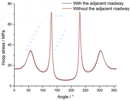 Based on the calculation method introduced above, we further calculated the peripheral hoop stress of the roadway of Stope 101 after the excavation of the adjacent roadway of Stope 102. The distribution curve is shown in Figure 9. Combined with Figure 7, it indicates that when the roadway of the adjacent stope is not excavated, the hoop stress at the sidewall monitoring points on both sides of the roadway is 14.5 MPa. After the excavation of the adjacent roadway, the stress distribution outside the roadway is no longer symmetrical. The hoop stress at the sidewall monitoring point on the side closer to the adjacent roadway increased to 15.7 MPa, an increase of 8.3%, while the hoop stress at the sidewall monitoring point on the side away from the neighboring roadway is 15.1 MPa, an increase of 4.1%. The stress values at the middle monitoring points of the roof and floor decreased by 4.1% and 6.9%, respectively. Figure 10 further presents a comparison of the stress distribution curves of Stope 101 before and after the excavation of the adjacent roadway. Overall, since the distance between the two opening centers is relatively large compared to the size of the roadway itself, the impact of the adjacent stope’s roadway on the stress field around the existing roadway is very limited, and the mutual influence between the two can be essentially ignored.