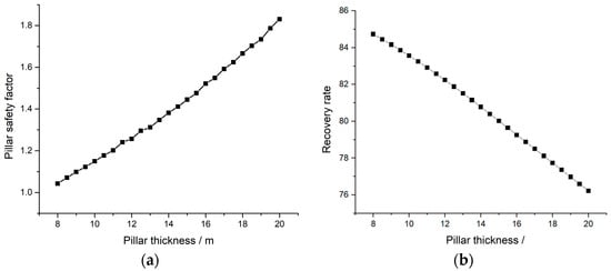 Variation curves of pillar safety factor and stope recovery rate with increasing pillar thickness. (a) Curve for pillar safety factor. (b) Curve for stope recovery rate.