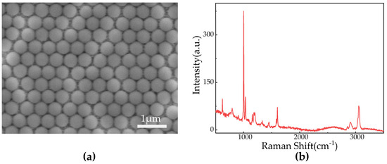 The morphological analysis and characterization of the PSM are crucial steps in our investigation. Field-emission scanning electron microscopy (SEM) is employed to explore the morphology and size distribution of the PSM, as depicted in Figure 2a. The SEM images provide valuable insights into the structural characteristics of these microspheres. It can be seen that the microspheres are uniform in shape and size and uniform in arrangement. In addition to morphological analysis, we conducted Raman spectroscopy to assess the material quality and composition of the PSM-SA samples, as presented in Figure 2b. Raman spectroscopy is a powerful tool for identifying and quantifying molecular vibrations in materials. In our spectra, specific peaks corresponding to the PS material [40] are clearly observed, providing a deeper understanding of the chemical characteristics of our samples. For example, the Raman spectra reveal distinctive peaks indicative of PS. The peak at 1002 cm−1 corresponds to aromatic respiration, while the peak at 620 cm−1 indicates the deformation of the benzene ring. Further insights are gained from peaks at 902 cm−1 and 1023 cm−1, which are associated with the out-of-plane bending vibrations of C–H and C–O bonds, respectively. The C–H bending vibration occurs at 1030 cm−1. Additionally, peaks at 1490 cm−1, 1447 cm−1, and 1602 cm−1 correspond to the stretching vibrations of the C=C bond on the benzene ring. The peaks at 2846 cm−1 and 2924 cm−1 arise from the symmetric and asymmetric stretching vibrations of –CH2 bonds, while the region of 3100–3000 cm−1 corresponds to the stretching of the =C–H bond on the benzene ring. This comprehensive Raman spectroscopic analysis provides evidence of the PS material and offers valuable insights into its molecular structure and chemical composition. Such characterization is fundamental to our understanding of the PSM-SA samples and their suitability for the intended applications in our study.